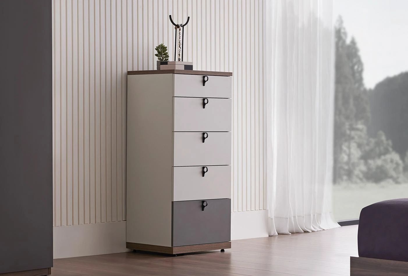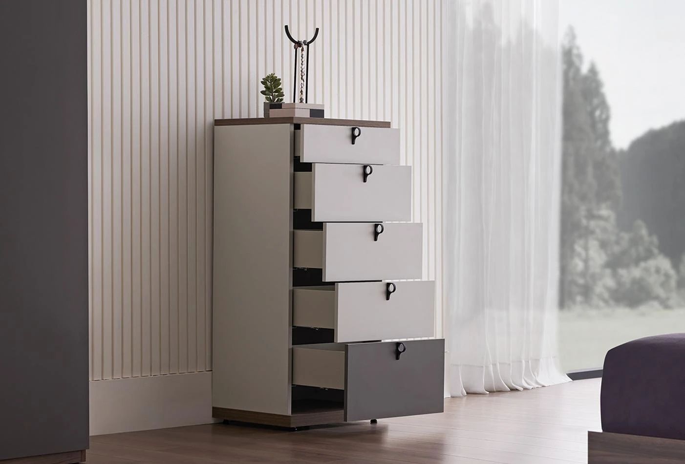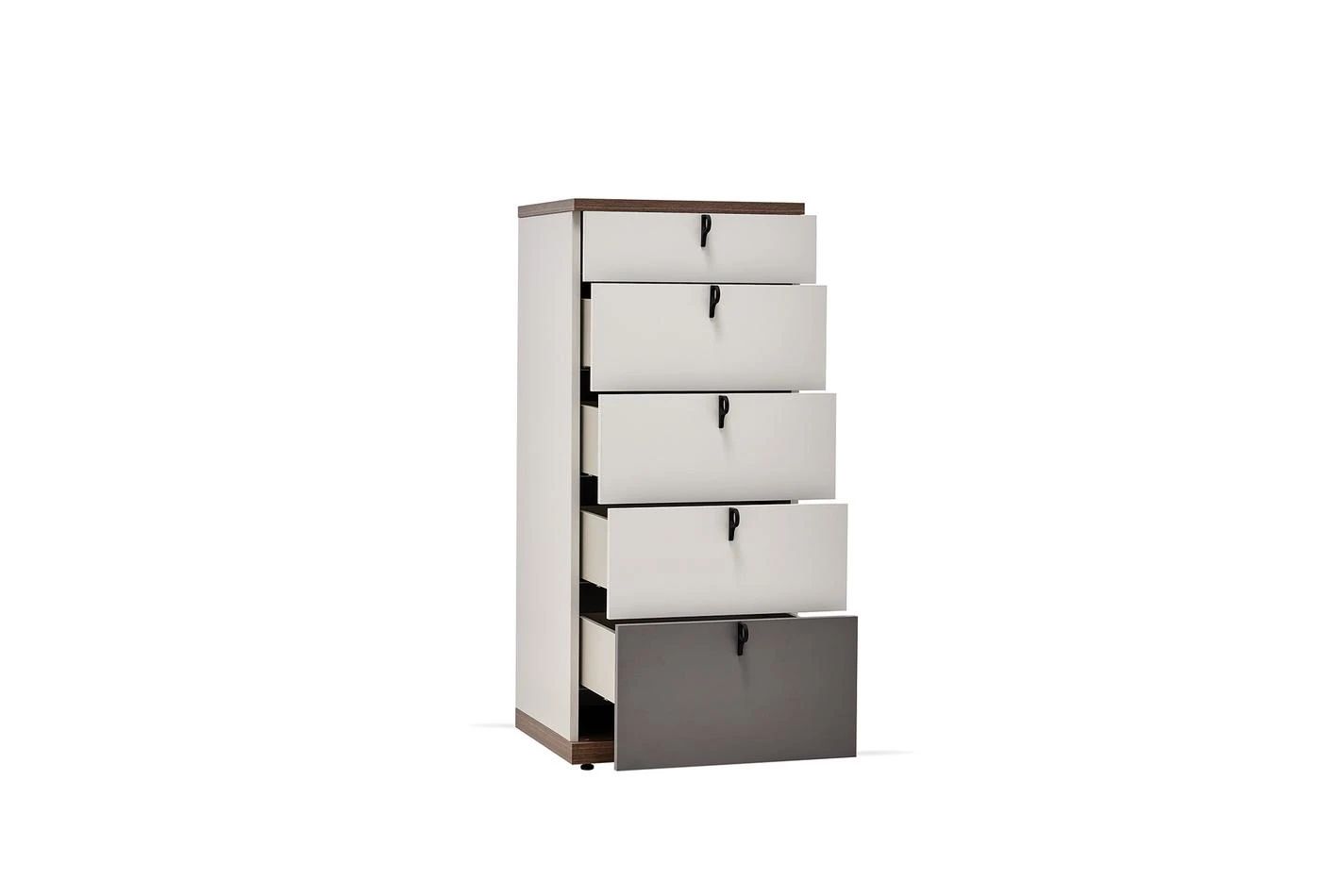 Откроява се със своите 5 чекмеджета и предлага решения за нуждите от пространство за съхранение. Благодарение на забавящата се панта и релсова система, той осигурява тиха и безопасна употреба.