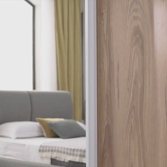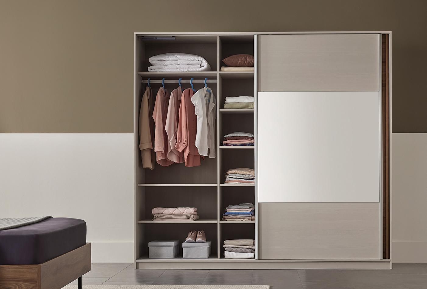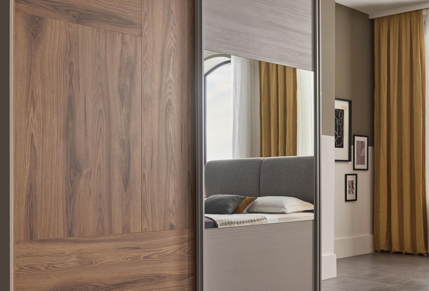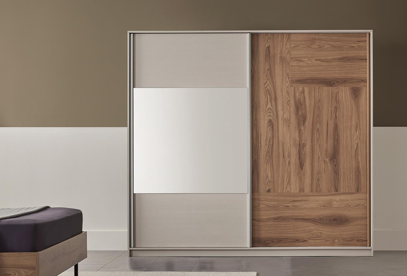 Перфектното цветово съчетание и текстурите на различните елементи, в комбинация с огледалото от закалено стъкло в гардероба придават усещане за пространство във Вашата спалня. А зад вратите се открива завидно място за съхранение с функционало разпределение.