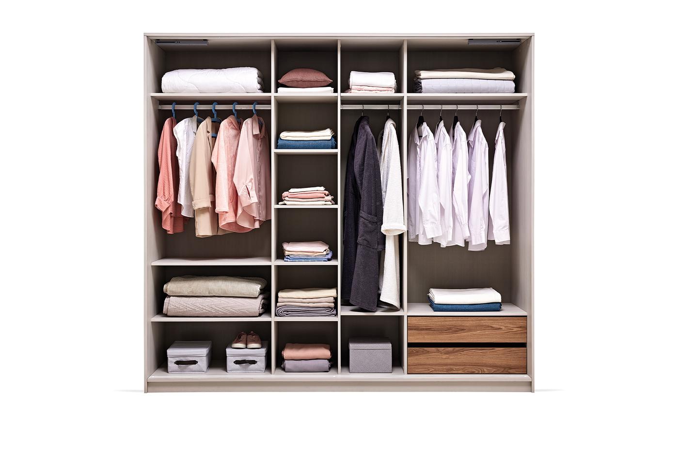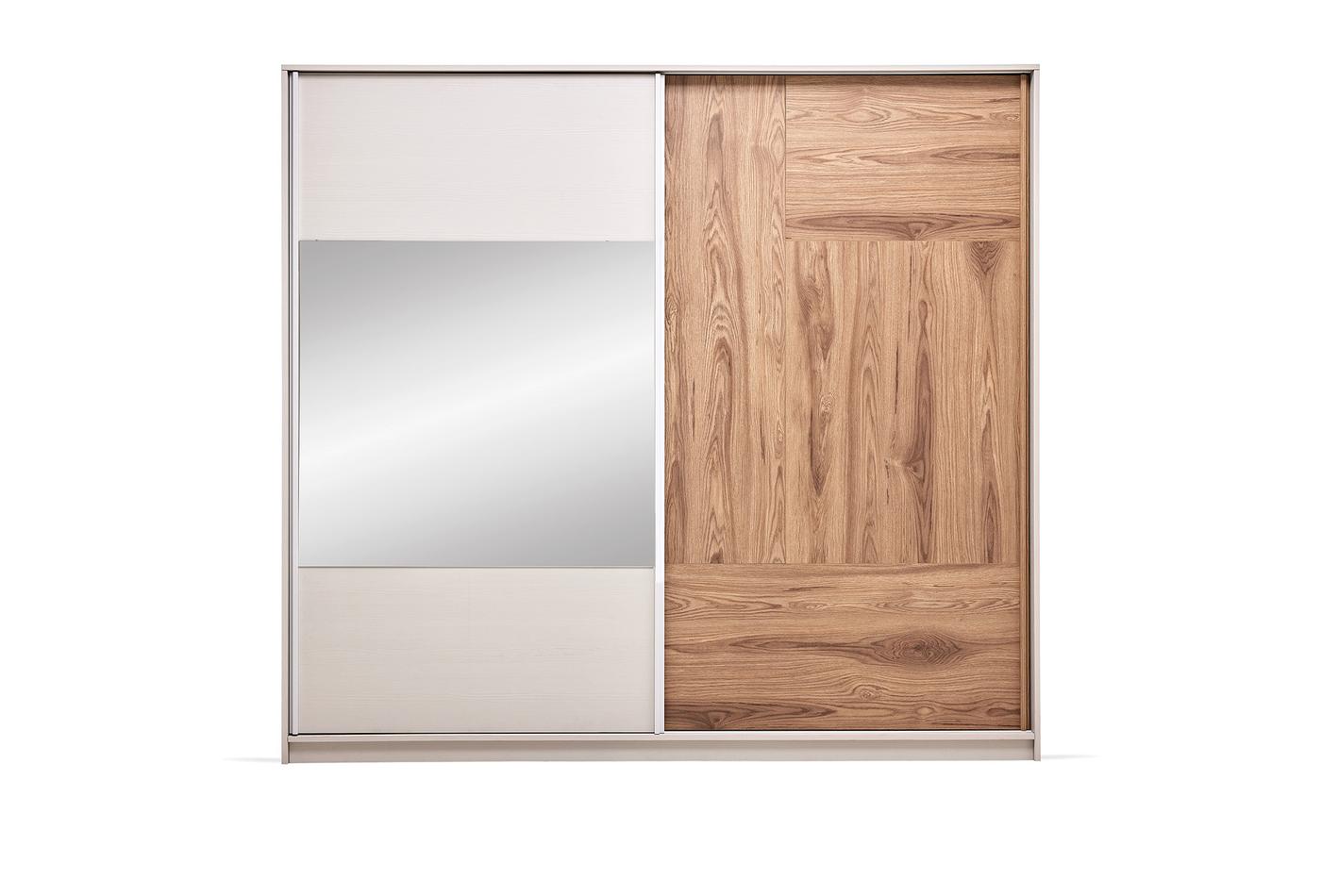 Перфектното цветово съчетание и текстурите на различните елементи, в комбинация с огледалото от закалено стъкло в гардероба придават усещане за пространство във Вашата спалня. А зад вратите се открива завидно място за съхранение с функционало разпределение.