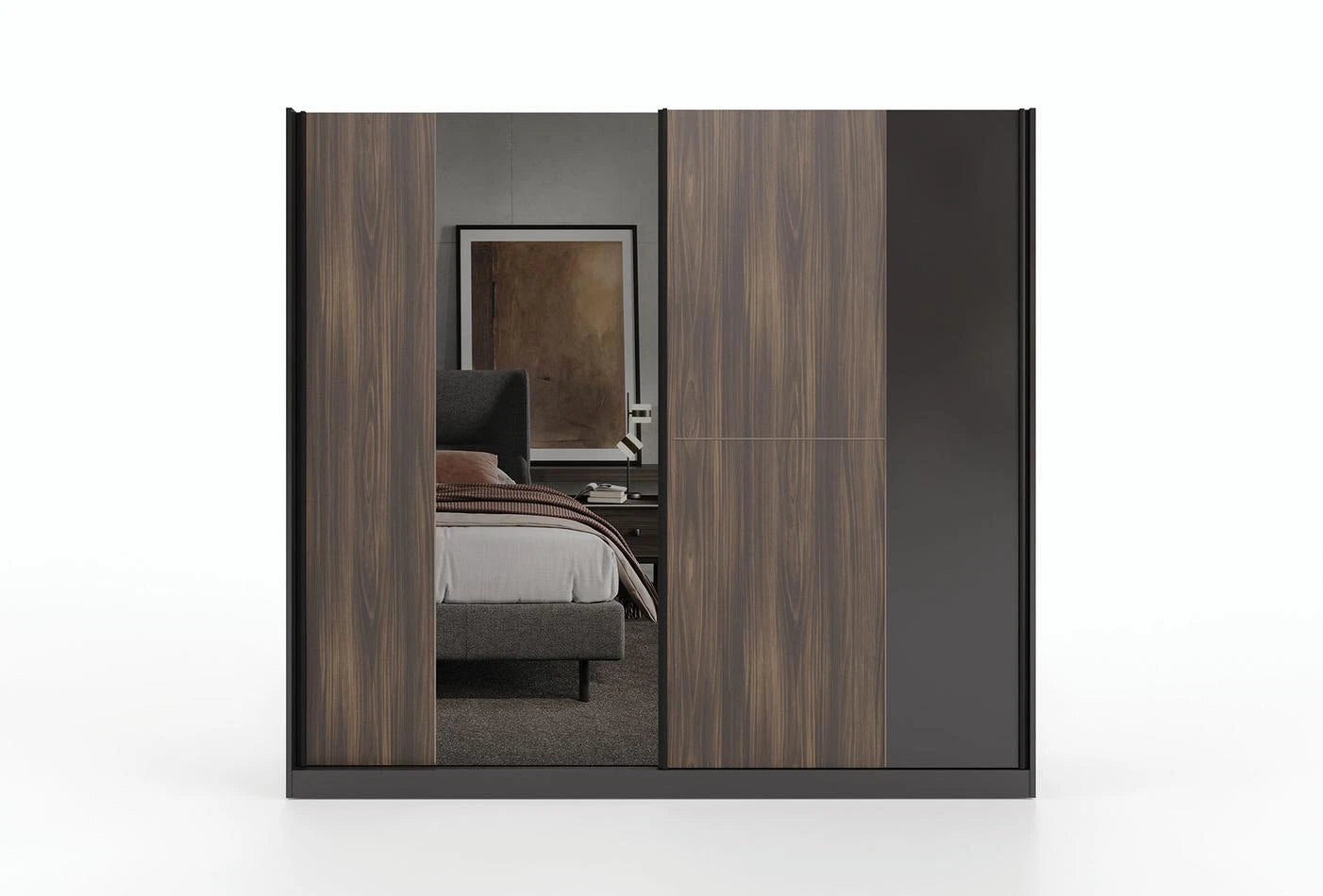 Проектиран с уникалната комбинация от тъмен орех и матово черно, гардеробът с плъзгащи се врати PARMA заема своето място в най-модерните жилищни пространства! Разкрива подходяща визия за всяко помещение със своя съвременен дизайн. Обещава дълготрайна употреба със силната си конструкция.