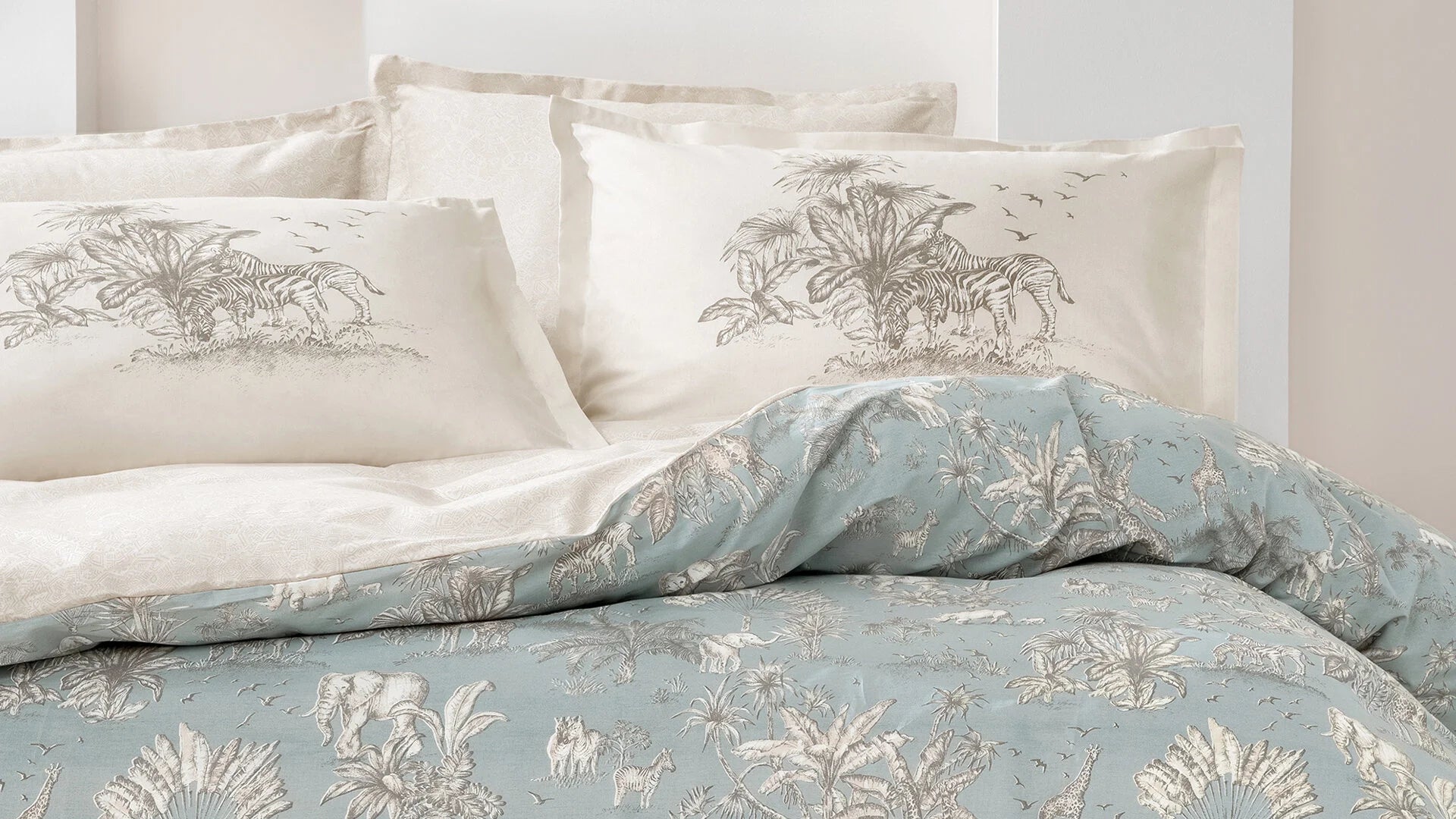 С уникалния си дизайнерски десен, той пренася впечатляващата визия на топлите климатични зони и природните пейзажи директно в спалнята. Осигурява мекота и комфорт за спокоен сън, благодарение на 100% памучна материя.