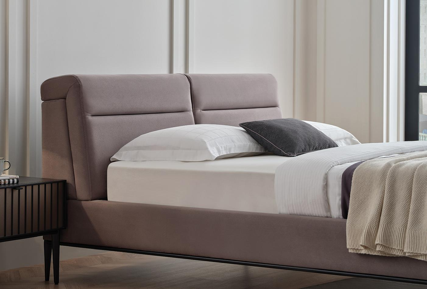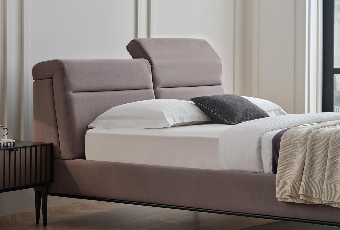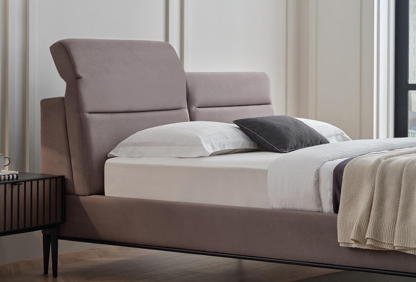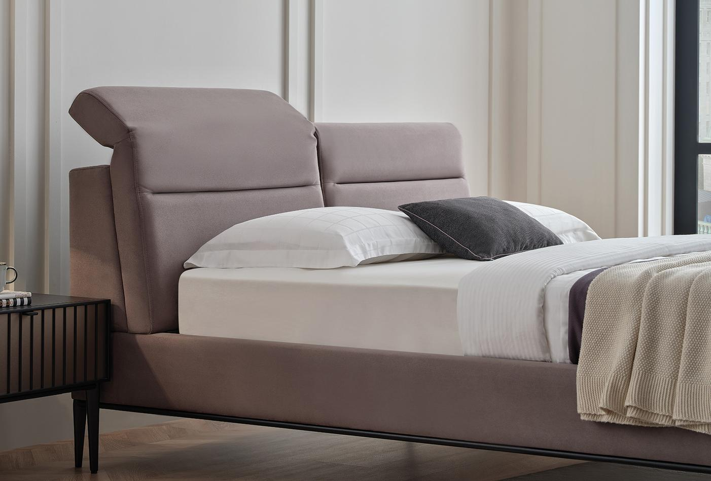 Леглото от колекцията има необичайна функционална табла. Оборудван е с 4-степенен механизъм за регулиране на наклона на таблата, което прави леглото още по-удобно и привлекателно. Краката на леглото са в матово черно, за да паснат на цялата колекция.Със своя модерен и луксозен външен вид ще се впише във всеки интериор.