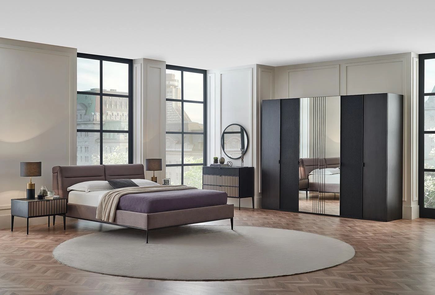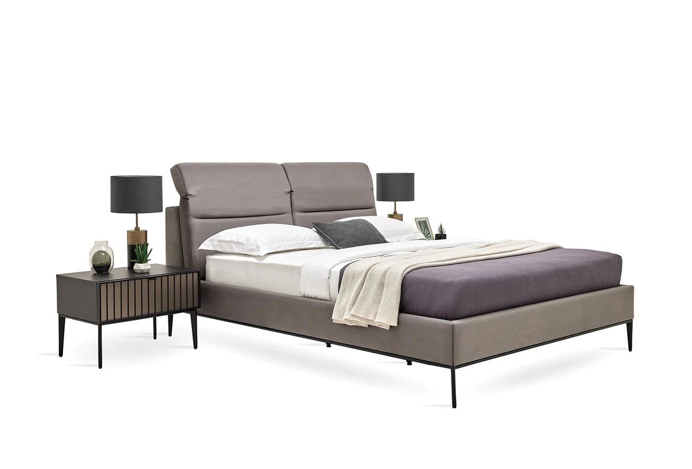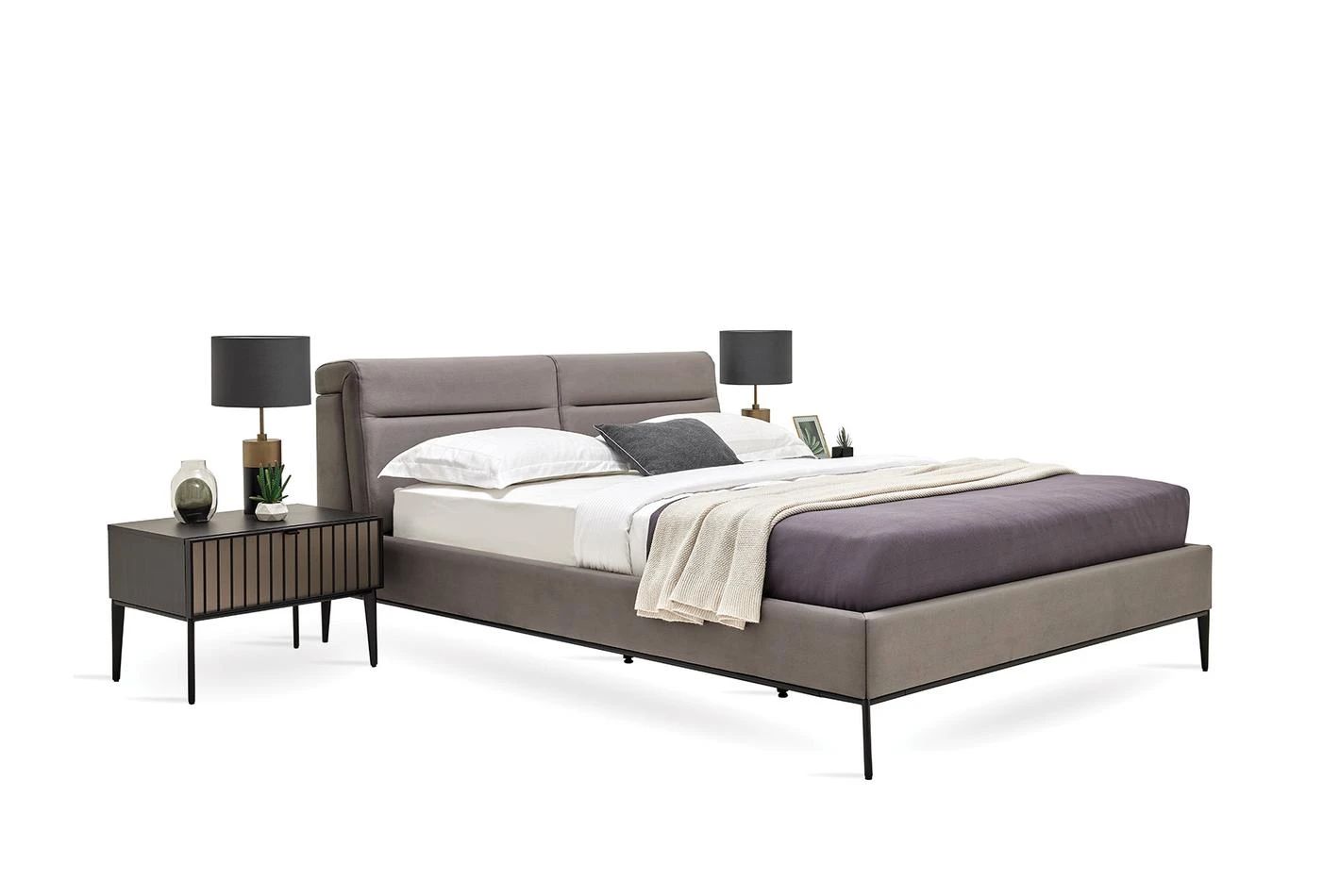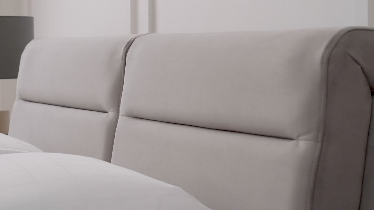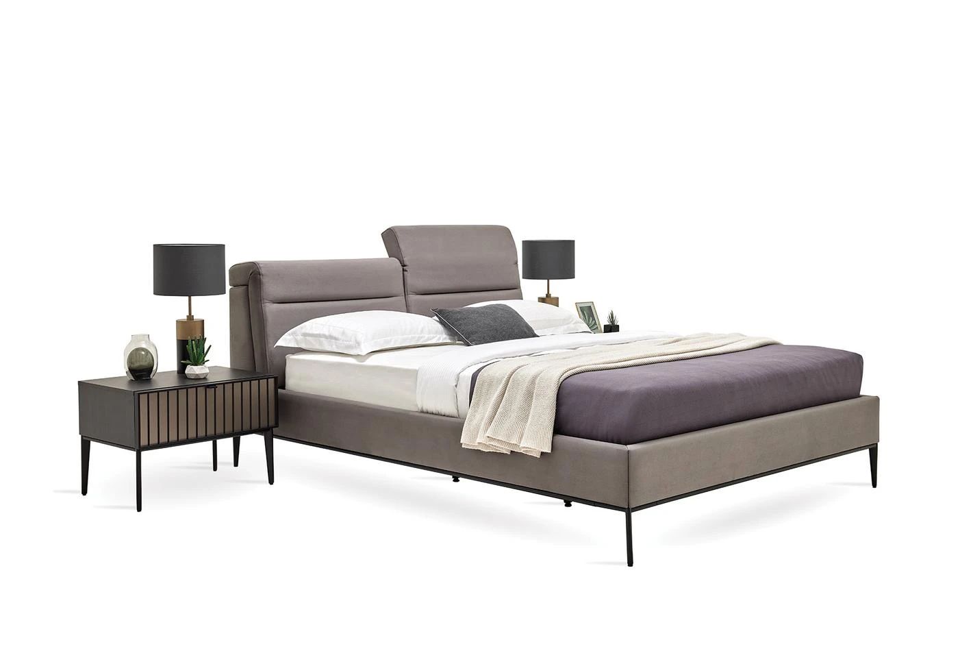 Леглото от колекцията има необичайна функционална табла. Оборудван е с 4-степенен механизъм за регулиране на наклона на таблата, което прави леглото още по-удобно и привлекателно. Краката на леглото са в матово черно, за да паснат на цялата колекция.Със своя модерен и луксозен външен вид ще се впише във всеки интериор.