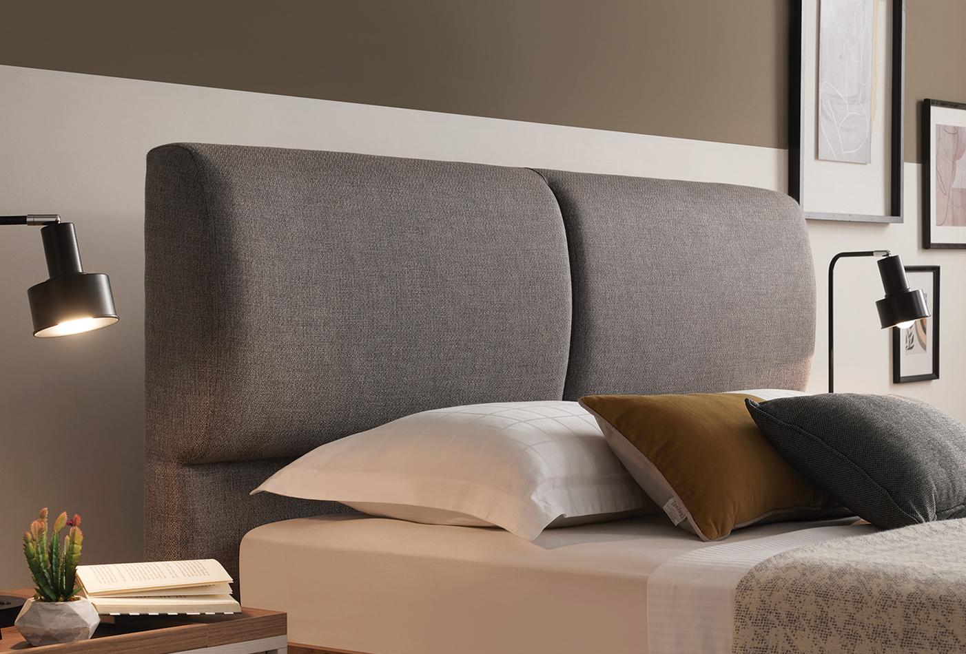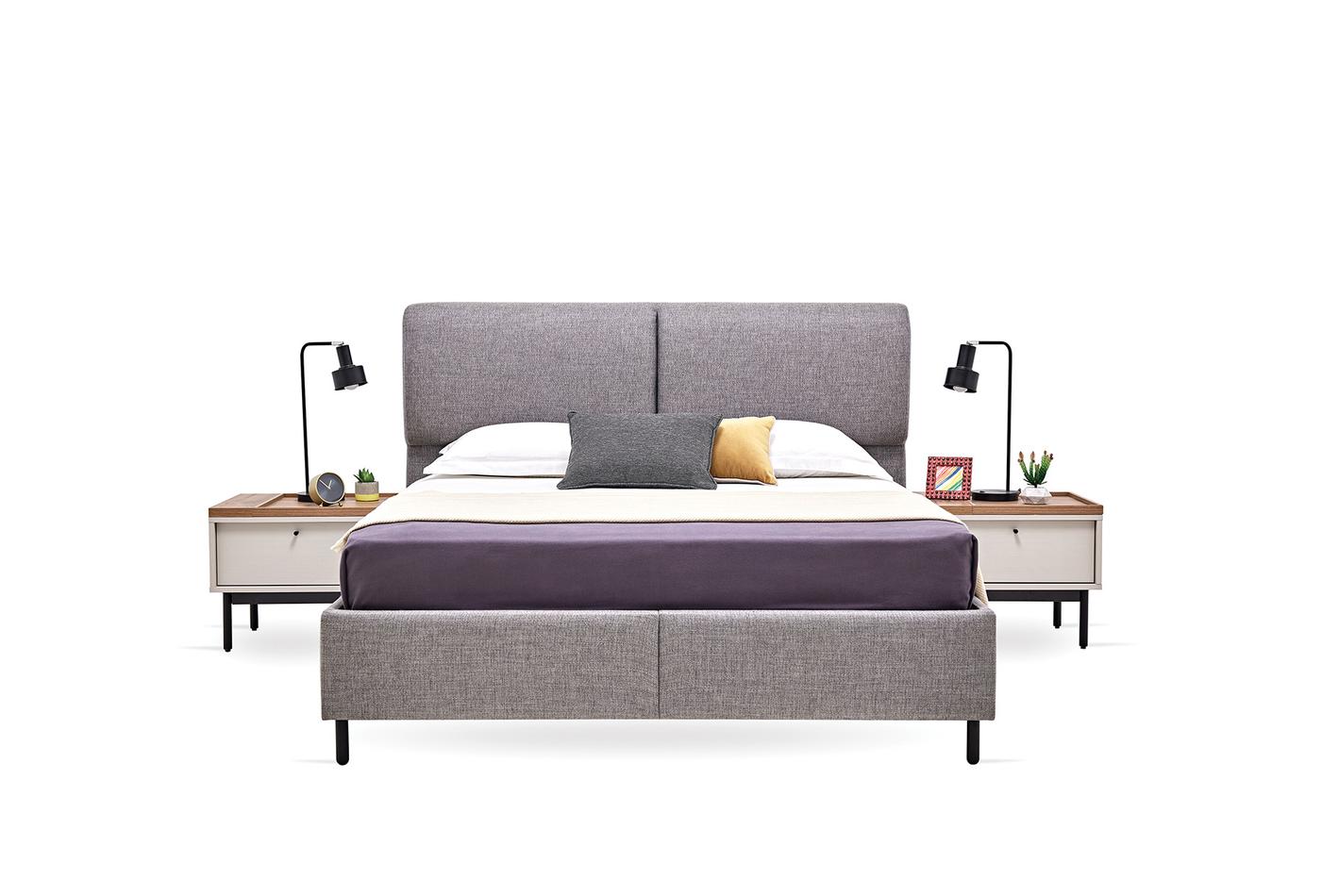 Модерните изчистени линии са откриват и в спалнята на серия Loreto. Леглото е тапицирано в тъкана дамаска и разполага с голямо складово пространство. Базата е елегантно подчертана с черни метални крачета в индустриален стил. Опция за избор между няколко цвята.