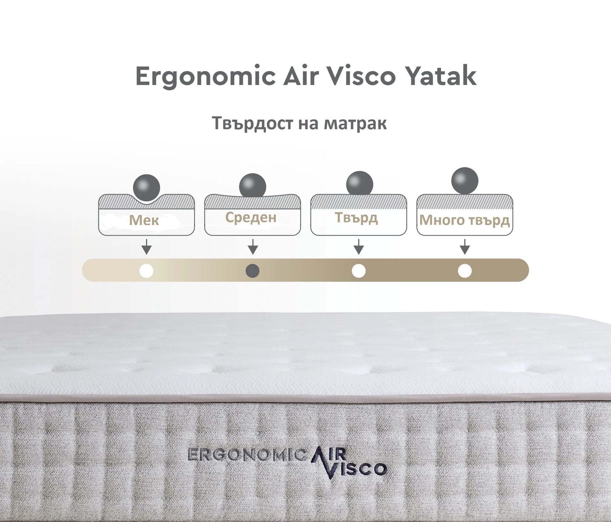 Оборудван с технологии, които перфектно се адаптират към различните телосложения, матракът Ergonomic Air Visco предлага идеална температура за сън през лятото и зимата благодарение на двустранната употреба. Вискоеластичната мемори пяна с технология с отворени клетки помага на мускулите да си починат, като осигурява идеална опора на тялото. Като спомага за поддържане на естествената извивка на гръбначния стълб, той помага за намаляване на неволните въртеливи движения по време на сън, като обгръща тялото правилно. Индивидуално пакетираните и независимо работещи пружини се адаптират идеално към всяко тяло и осигуряват правилна опора на гръбначния стълб, като поддържат извивките на тялото. Ice Touch, специална охлаждаща материя на Yataş създава хладна среда за сън. Woolmark® технология подходящ за всички сезони, разпределяйки равномерно топлината със своята чиста вълна Woolmark®.