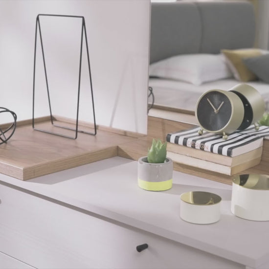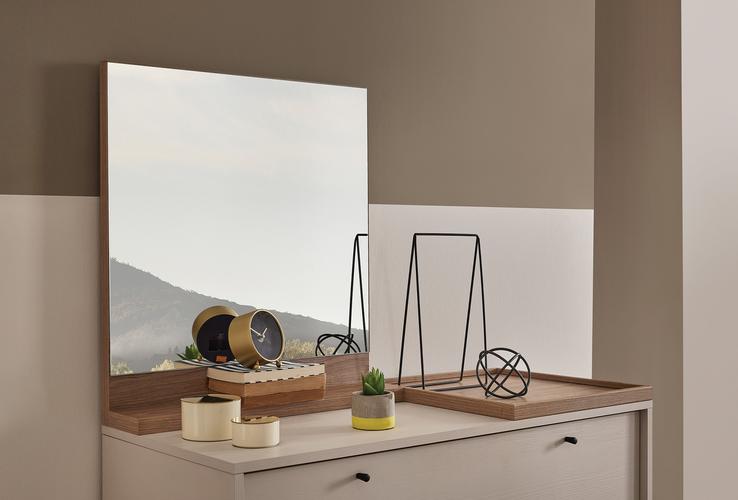 Предлага възможност да се използва както на масата, така и като се окачи на стената. Правоъгълното естествено огледало в дизайна добавя декоративна атмосфера със своята елегантност.