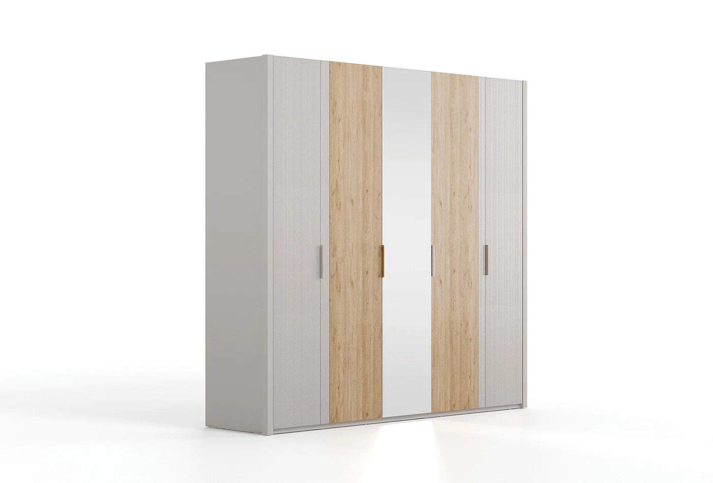 Със своята комбинация от естествен дъб и бежов цвят внася топла и елегантна атмосфера в спалните ви. Специалните шарени текстури и огледалата в естествен цвят, използвани при вратите, подчертават естетическата стойност на дизайна, а металните дръжки от инокс добавят модерно докосване.