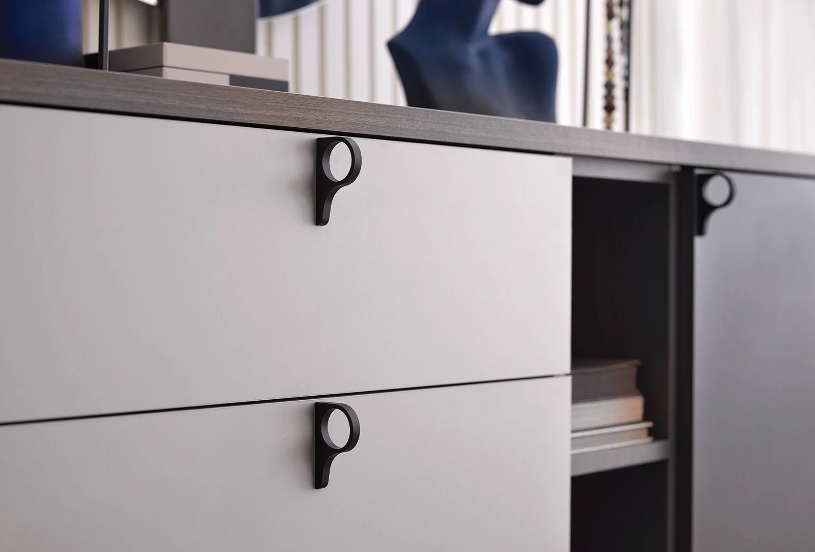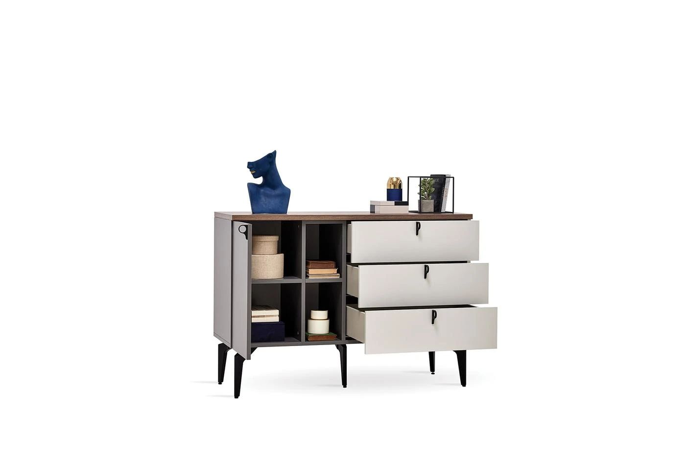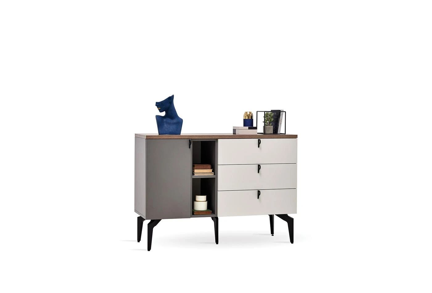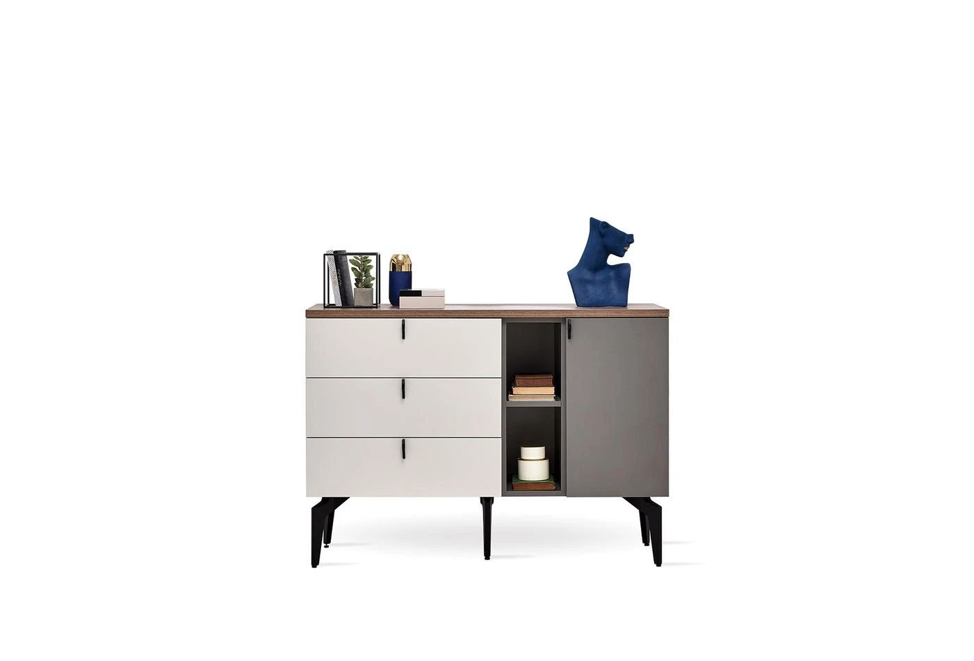 Със своите 3 чекмеджета и 1 врата, се откроява с функционалния си аспект и предлага решения за нуждите от пространство за съхранение. Благодарение на забавящата се панта и релсова система, той осигурява тиха и безопасна употреба.