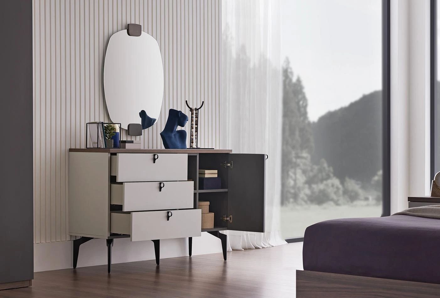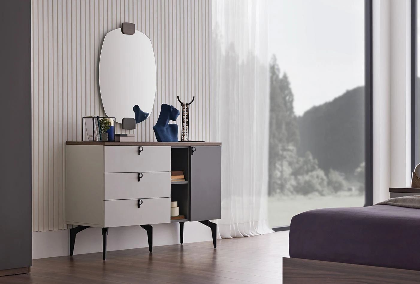 Цветова комбинация от крем, сиво, орех и метален матов черен дизайн на дръжки.