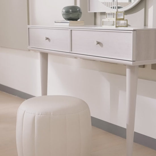 Отроява се с уникалния си стил, който придава на спалните елегантен вид. Оригиналният дизайн под формата на цилиндър, в който се усеща меката текстура на кремавия тон, предлага удобно използване в зоната за гримиране.