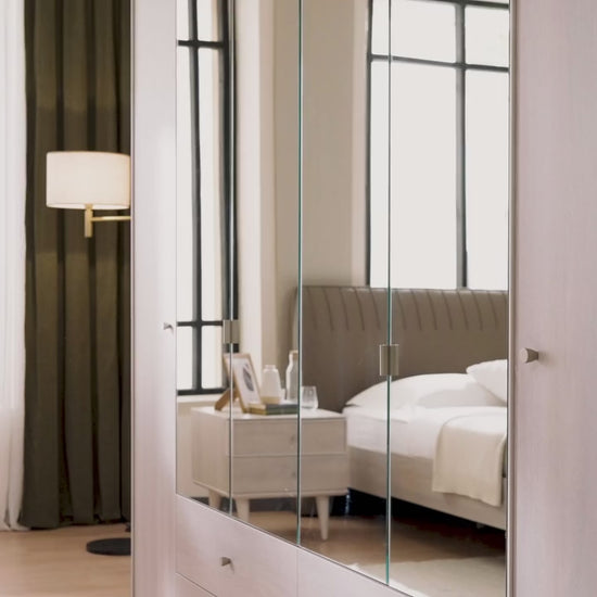 Привличайки вниманието с минималистичния си дизайн добавя модерен щрих, като придава светъл и приветлив вид на пространствата, в които се намира. Проектиран в цветова комбинация от светъл дъб и светло бежово. Привлича вниманието с огледалната си апликация в естествен цвят и профилни детайли, които допълват дизайна, като същевременно извеждат елегантността на преден план с дизайна на дръжките си в цвят метален никел в хармония с колекцията апликацията на акордеон. Предлага възможност за съхранение на различни видове предмети с 4 приложения за чекмеджета. По този начин може да се получи допълнително място за много артикули.