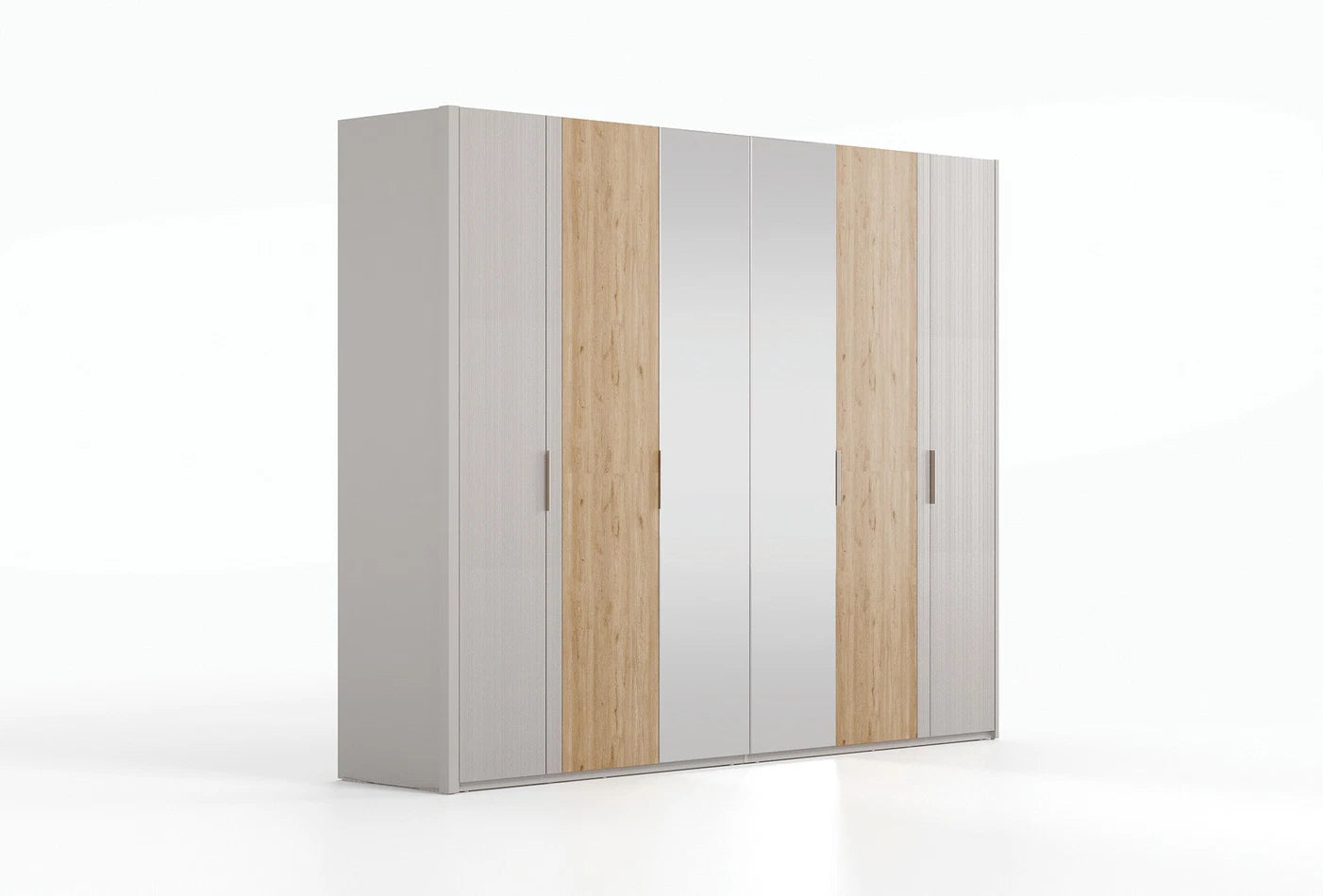 Със своята комбинация от естествен дъб и бежов цвят внася топла и елегантна атмосфера в спалните ви. Специалните шарени текстури и огледалата в естествен цвят, използвани при вратите, подчертават естетическата стойност на дизайна, а металните дръжки от инокс добавят модерно докосване.